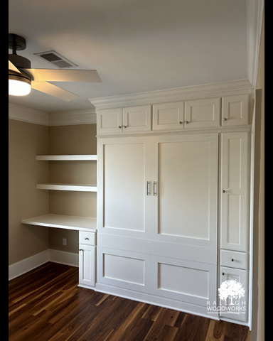Need a guest room, but also need an office, playroom, or home gym? A custom Murphy bed might be the solution you didn’t know you needed. At Raleigh Woodworks, we build high-quality, space-saving wall beds that fold away beautifully — often paired with built-in shelving, storage cabinets, desks, or wardrobes to make the most of your room.